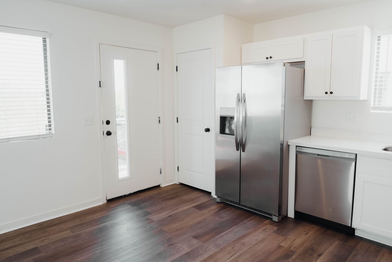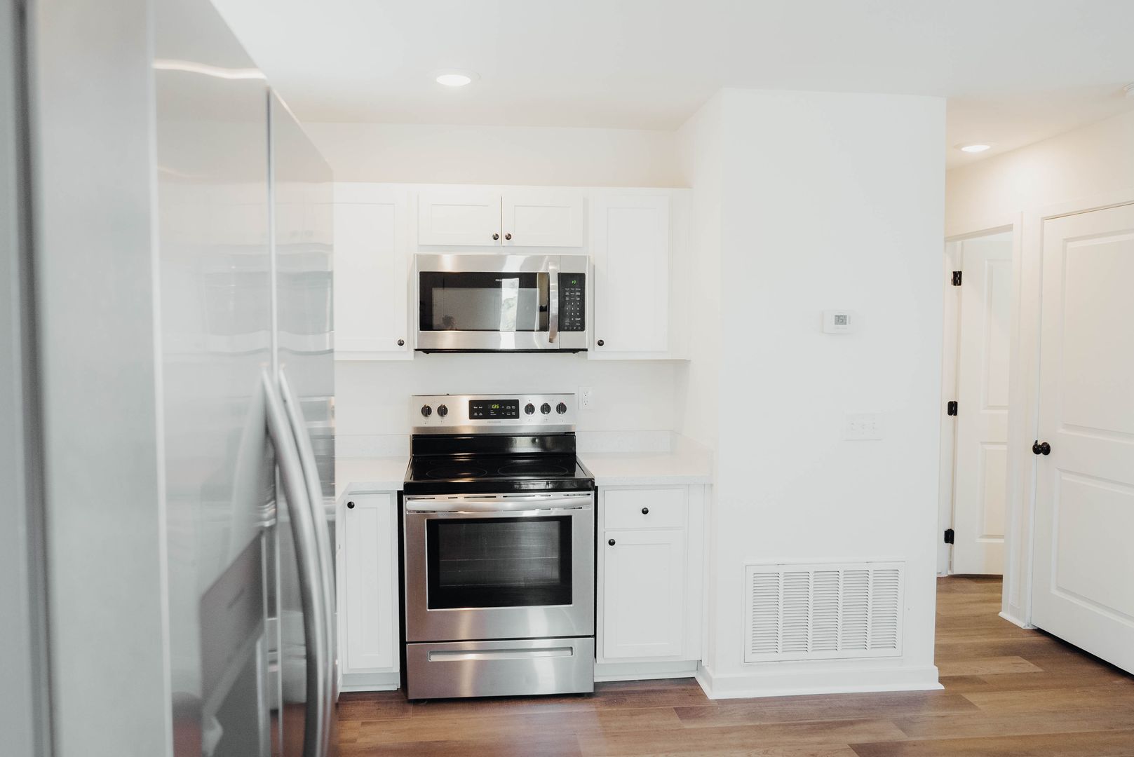 Modern Stainless Steel Kitchen – Upgraded appliances including refrigerator, stove, microwave, and dishwasher, paired with bright white cabinetry and quartz-style countertops.